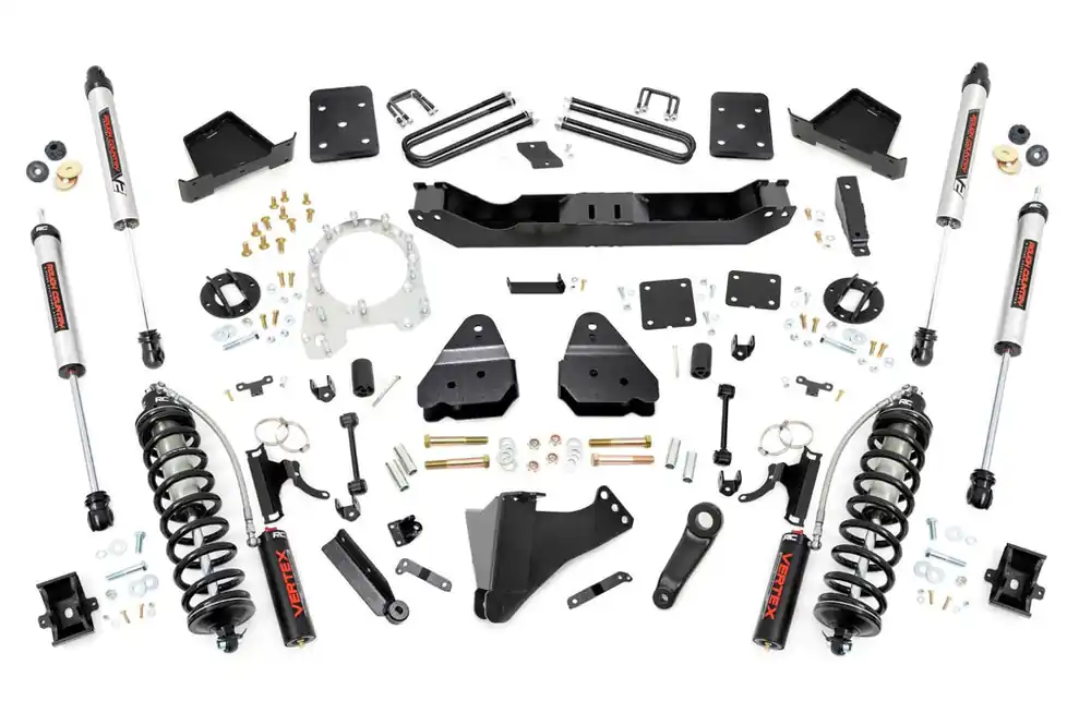 Explore New Heights. Give your fourth-generation Ford Super Duty superior lift height with Rough Country’s 4.5-inch Coilover Suspension Lift Kit! This all-inclusive kit comes with everything you need for a total transformation of your truck. Run up to 35in tires while preserving the smooth, factory ride quality with this impressive upgrade.\\Durable Components. When changing a vehicle’s suspension, the key to preserving ride quality is keeping the geometry of all suspension components as close to their factory angles as possible. Rough Country’s new 4.5-inch Suspension Lift features a set of ultra-durable radius arm drop brackets, precision fit to bolt right into the factory mounts for an easier install and a more factory-like angle.┬áUtilizing this conversion kit you’re removing the factory independent coil shock and coil set-up and replacing it with a massive 2.5in piston, nitrogen-charged, 8-stage adjustable Vertex Coilover. Rough CountryΓÇÖs Vertex Coilovers feature a monotube design with an external reservoir for increased oil capacity and damping sensitivity. When it comes to investing in a high-end kit, youΓÇÖll be pleased to find that Rough CountryΓÇÖs 2.5in piston design is beefier and offers an impressive 56% greater fluid capacity than the average reservoir shock. Each kit is paired with a monotube shock that provides optimal damping control.\\Installation. Requiring cutting and drilling to install, an estimated timeframe of 6-10 hours is recommended to complete this full installation. This full kit can be installed at home and can be completed efficiently and quickly!\\Limited Lifetime Replacement Warranty. Rough Country’s 6-inch Coilover Suspension Lift Kit is backed with a limited lifetime replacement warranty towards manufacturer defects. As such, the product is protected from structural and workmanship damage after the date of purchase. With our industry-leading warranty give yourself peace of mind when using Rough Country’s Suspension products!