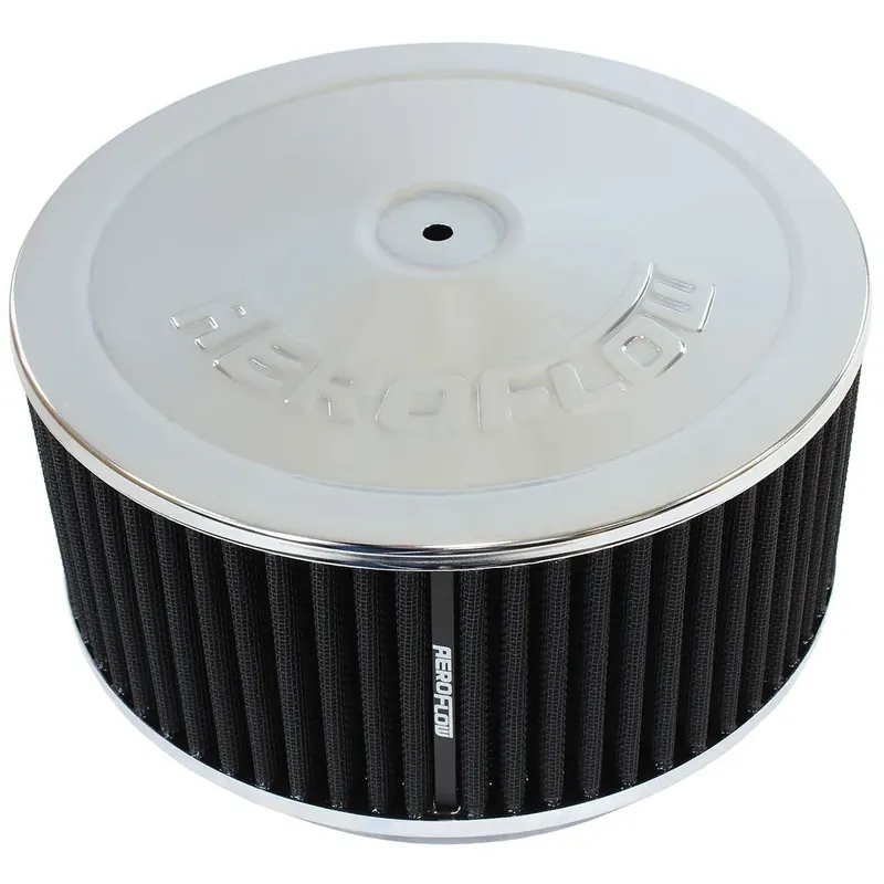 Stand out from the crowd with a magnificent looking Aeroflow air cleaner. These air cleaners are stamped from high quality steel. Available in many different great finishes and styles for that custom look you are after. Chrome-plated or black finish with reusable/washable or paper elements. Aeroflow air filter assemblies work with all popular standard 4150 (5-1/8″” / 130mm) carburettors and 4500 Dominator (7-5/16″” /186mm) carburettors. The 14″” (355.60mm) air filter assemblies come with a drop base that sits 1-1/8″” (28mm) below the carburettor.