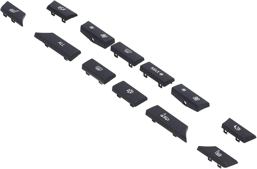 Introducing the Heater Climate Control Button Cap, designed to replace and protect the smooth air conditioning buttons on your BMW 5 Series (F10) & 5 Gran Turismo (F07). This set of 12 caps adds a touch of style and protects your buttons from wear and tear. Keep your car looking new with this easy-to-install upgrade.
