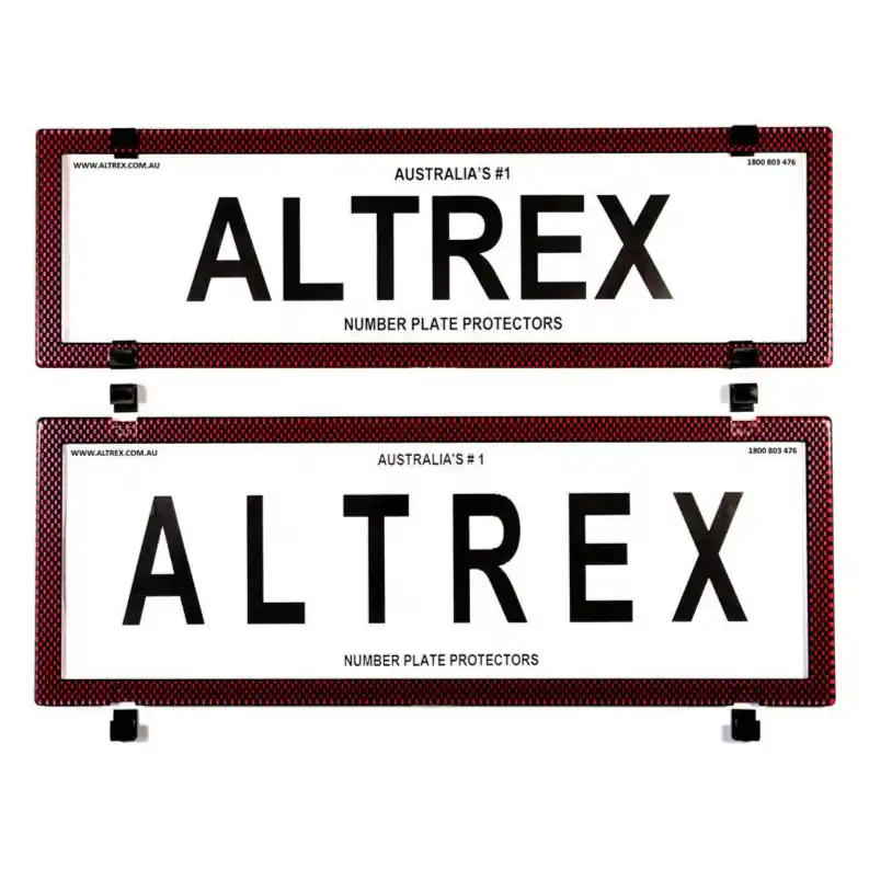 Home / Accessories / Brand New Altrex QLD, ACT, VIC, TAS, SA, WA \\u0026 NT Slimline Combination Red Carbon Fibre Number Plate Protector Covers – without Lines – 6SERQ