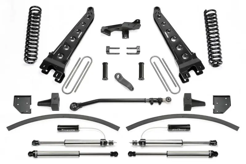 Fabtech?s 8″ Radius Arm system for the Ford Super Duty is built to handle the on and offroad demands of the truck enthusiast. This Radius Arm system is a heavy duty upgrade to the factory suspension and will provide additional strength to the vehicle.The heart of this quality system is Fabtech?s legendary tubular Radius Arms. The design of these arms comes from Fabtech?s racing experience and are built with a tubular structure reinforced by dimple die side plates and heavy gusseting for rugged offroad use. They are superior in strength to the stock stamped arms.Unique to this 8″ system is Fabtech?s extended length Track Bar to address the hyper sensitive steering box of the late model Super Duty. Fabtech is the only manufacturer with this ground breaking system that offers proper steering performance. Fabtech?s extended length Track Bar is 4″ longer than stock and is offset to the driver side with a stout 1/4″ thick steel mounting bracket. This design helps keep the Track Bar and Draglink closer to parallel than the factory angles to reduce push in the steering. The Track Bar allows for full lock steering of 15.50 wide tires w/ 4 3/4″ BS wheels.This high quality 8″ System provides increased strength and performance for the demanding Super Duty enthusiast.System includes a free 5 year 60,000 mile powertrain warranty.Each Fabtech component has been designed with specific features and benefits that create this quality suspension system.