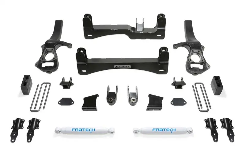 Fabtech?s Basic lift kit features our world renowned IFS suspension design for the Chevy/GMC 1500 2WD providing excellent drive ability both on and offroad. There is zero bump steer throughout the suspension cycle that helps reduce drive fatigue while improving the overall drive ability of the vehicle. The near stock track width keeps the tires under the fenders for a clean appearance. Fabtech?s proprietary steering knuckle geometry provides excellent lock to lock turning radius to maneuver in tight spots. Heavy duty 1/4? thick steel crossmembers feature OE style alignment cam pins that utilize the factory cams for easy adjustment. The factory coilover shocks are relocated from the bottom to allow for full steer while achieving 6? of lift. Rear lift is accomplished with a 5? Block and u-bolt system. Fabtech has addressed all aspects of the suspension for proper wheel travel and lock to lock steering without over cycling. Comes with a free 5 year 60,000 mile Powertrain Warranty. FEATURES: 1/4? thick steel lower control arm Crossmembers are arched for maximum ground clearance. The welded box design of these Crossmembers provides additional strength to the front suspension. Retains factory alignment cams for easy adjustment. Fabtech?s extended length ductile iron Steering Knuckles provide zero bump steer throughout the suspension travel. This provides an enhanced driver experience compared to stock. Near stock track width keeps the tires under the fenders for a clean appearance. Oversized tie rods are provided to replace the stock units that are designed to handle oversized tires. The factory Coilovers are relocated with heavy duty lower mounts to lift the vehicle while retaining the stock ride quality. 1/4? thick steel drop brackets reposition the front sway bar for the increased ride height. This allows the sway bar link ends to fully cycle without binding throughout the extended travel range. Billet spacers relocate the factory closed cell bump stops to c