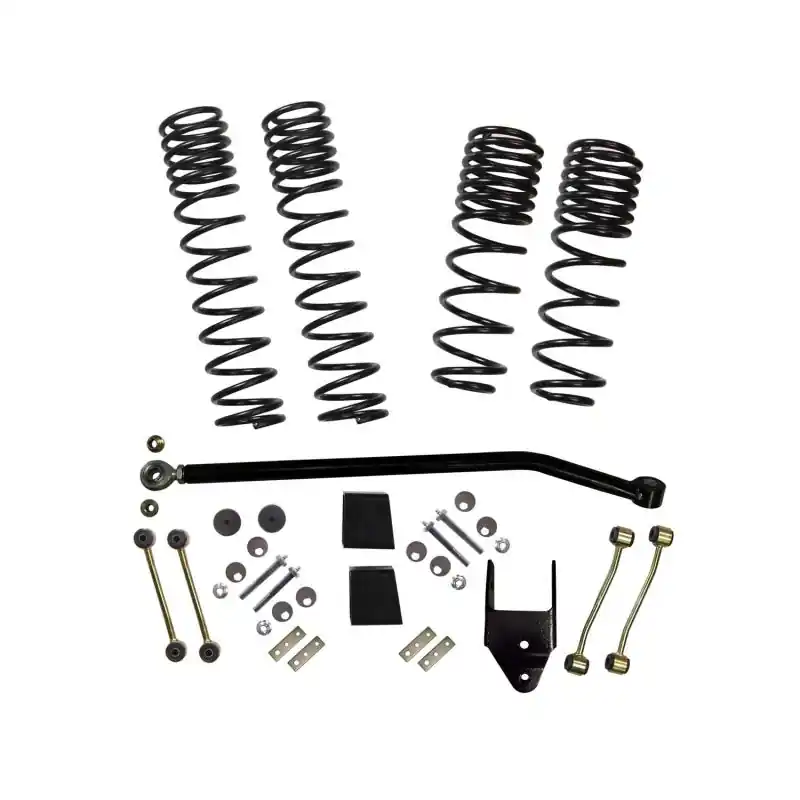 Skyjacker specifically engineered a progressive variable rate coil spring, distinctively a 2-stage dual rate long travel coil. Spring rate progression is from a 1st Flex Rate to a 2nd Ride Rate. The 1st Flex Rate stage delivers a comfortable ride with the ability to flex for increased articulation. The flex rate expands during full articulation as the suspension drops (full droop). This keeps the coil springs seated in the upper coil mount/bucket and the tires in contact with the terrain. The 2nd Ride Rate stage only engages after compression past the flex rate. Engineered to coordinate with the Wrangler’s distinctive suspension handling characteristics, the rear coils are side specific. The replacement Front Adjustable Track Bar includes Skyjacker installed pressed-in HD OEM style rubber bushing and an adjustable 3/4-inch Heavy-Duty Rod End, Jam Nut and Alignment Bushings. A heavy duty Rear Track Bar Upper Mount Bracket is included to center the axle under the vehicle properly. Front and Rear Bump Stop Spacers bolt onto the axle bump pads and keep the suspension travel safely in check. Front and Rear Extended Length Sway Bar End Links allow full articulation as the suspension drops (full droop). These sway bar end links include Skyjacker installed pressed-in HD OEM style rubber bushings. Proper suspension geometry ensures the Electronic Stability Control (ESC) system functions within factory parameters.