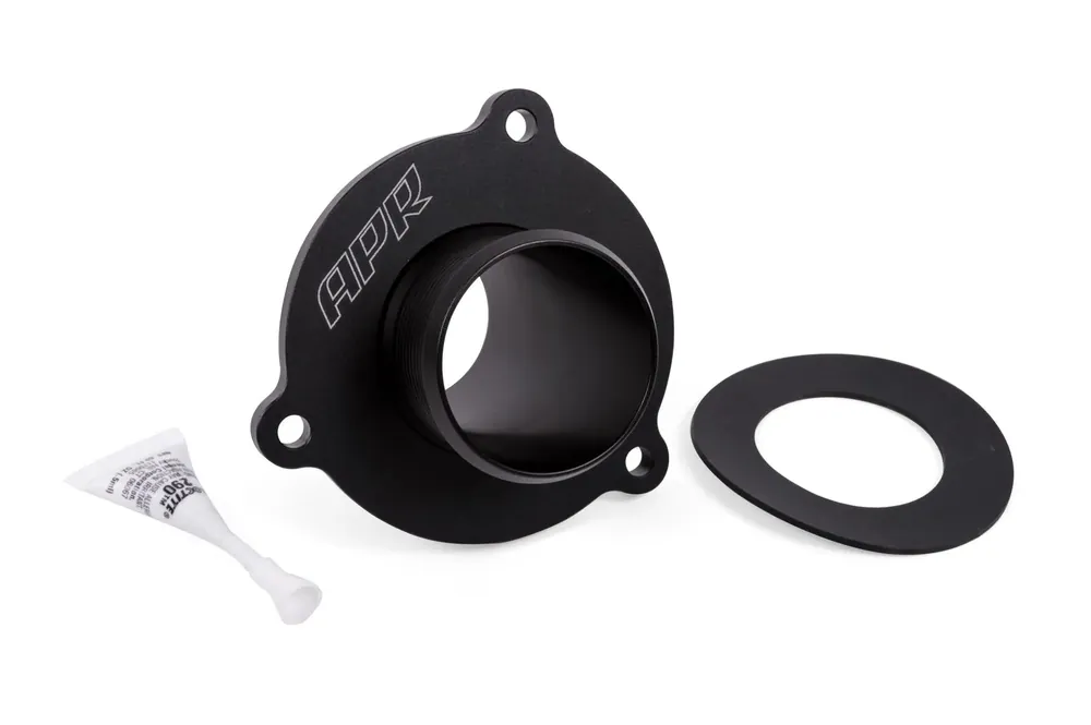 APR’s 2-piece design solves this issue with an adjustable height design. While a 2-piece design is more difficult and expensive to manufacture, it’s the only way to ensure an accurate fit and perfect seal. APR provides a Viton seal that’s placed at the bottom of the muffler housing. The muffler cover is then installed forming a seal with the factory gasket. Then, the center tube is inserted and screwed into place to the desired depth, compressing against the Viton seal to ensure a leak proof seal in every scenario. Finally Tension from the seal prevents the tube from coming loose, and the included Loctite provides extra security from movement. With the turbo muffler deleted, the APR design provides a smooth, turbulence free, and leak proof path for airflow existing the turbo!