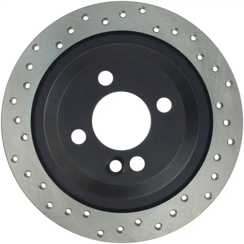 StopTech Drilled Sport Rotors are 1-piece direct replacement brake discs for factory brake systems and stock calipers that look great behind your wheels – and offer significantly improved braking performance. The unique cross-drilling aids with heat and brake dust dispersal; prevents glazing of the pads; adds bite and improves wet and dry braking performance. Built to last; the black e-coating provides protection from corrosion and the high carbon metallurgy (in most applications) offers quieter operation; better crack resistance and increased performance.