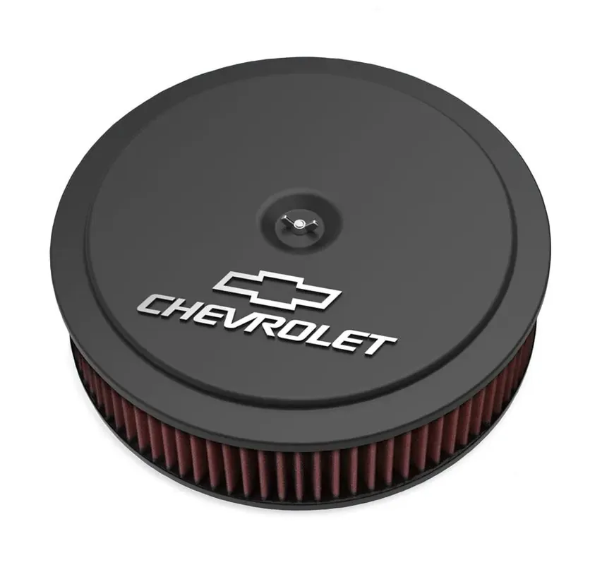 14″ round air cleaner kits are available with a premium element featuring red pre-oiled cotton gauze (washable and reusable) or a mesh-reinforced paper element – both options come in 3 and 4 inch heights.Each air cleaner kit includes a polished or black Sure-Flo base (designed for Holley 4150 and 4160 and other carburetors with 5.125″ diameter neck) and all mounting hardware necessary for installation. All GM Muscle Series accessories are available in four custom finishes: natural cast, polished, satin black, and factory orange (all finishes have machined “Chevrolet and Bowtie” logos aside from polished version).