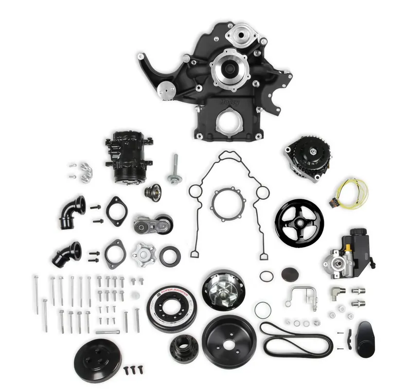 Holley’s complete, mid-mount accessory system has all accessories pulled in tighter than other accessory drives. At the heart of the system is a “bracketless” design (patent pending), where the accessories bolt directly to the timing cover for a clean, integrated system. The design offers superb engine visibility to show off your horsepower, not your accessories. Among the many swap friendly features are two optional heater connection configurations. The innovative Holley premium alternator incorporates 6-phase and square wire technology. The compact and reliable SD7 A/C compressor and Type II P/S pump with baffled reservoir are also integrated. The kit utilizes Holley’s proven cartridge style water pump. When we say “complete”, we mean complete. The Mid-Mount system comes with everything you need. All accessories are included; the water pump, A/C compressor, Alternator, P/S pump with reservoir, and the crank damper. All pulleys and the belt are supplied. Even heater hose adapters, power steering to-6 AN hardline, and the alternator plug/harness are included. Easy assembly was a priority during the entire development of this accessory solution. Color graphical instructions walk you through every step of the ultra-easy installation.