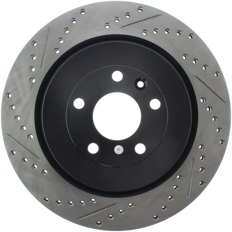 StopTech Drilled and Slotted Sport Rotors are 1-piece direct replacement brake discs for factory brake systems and stock calipers that look great behind your wheels – and offer significantly improved braking performance. The unique cross-drilling and slotting aids with heat and brake dust dispersal; prevents glazing of the pads; adds bite and improves wet and dry braking performance. Built to last; the black e-coating provides protection from corrosion and the high carbon metallurgy (in most applications) offers quieter operation; better crack resistance and increased performance.