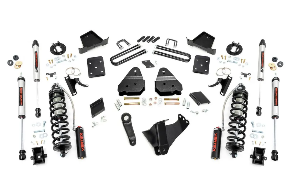 Explore New Heights. Give your third-generation Ford Super Duty superior lift height with Rough Country’s 4.5-inch Coilover Suspension Lift Kit! This all-inclusive kit comes with everything you need for a total transformation of your truck. Run up to 35in tires while preserving the smooth, factory ride quality with this impressive upgrade.\\Durable Components. When changing a vehicle’s suspension, the key to preserving ride quality is keeping the geometry of all suspension components as close to their factory angles as possible. Rough Country’s new 4.5-inch Suspension Lift features a set of ultra-durable radius arm drop brackets, precision fit to bolt right into the factory mounts for an easier install and a more factory-like angle. Utilizing this conversion kit you’re removing the factory independent coil shock and coil set-up and replacing it with a massive 2.5in piston, nitrogen-charged, 8-stage adjustable Vertex Coilover. Rough CountryΓÇÖs Vertex Coilovers feature a monotube design with an external reservoir for increased oil capacity and damping sensitivity. When it comes to investing in a high-end kit, youΓÇÖll be pleased to find that Rough CountryΓÇÖs 2.5in piston design is beefier and offers an impressive 56% greater fluid capacity than the average reservoir shock. Each kit is paired with a monotube shock that provides optimal damping control.\\Installation. Requiring cutting and drilling to install, an estimated timeframe of 6-10 hours is recommended to complete this full installation. This full kit can be installed at home and can be completed efficiently and quickly!\\Limited Lifetime Replacement Warranty. Rough Country’s 4.5-inch Coilover Suspension Lift Kit is backed with a limited lifetime replacement warranty towards manufacturer defects. As such, the product is protected from structural and workmanship damage after the date of purchase. With our industry-leading warranty give yourself peace of mind when using Rough Country’s Suspension products!