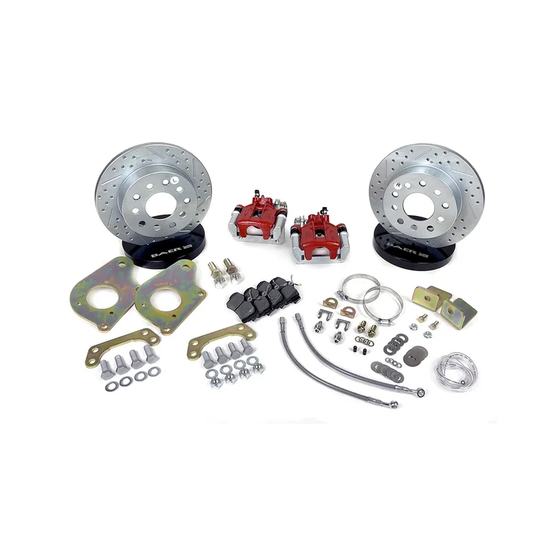 A cost-effective drum-to-disc conversion built around a single-piston caliper with an integral parking brake (red, dust-sealed, D627 pads) and 10.5″ one-piece slotted, dimpled, zinc-plated rotors. Calipers, rotors, brackets, stainless braided hoses, fittings, and hardware are all in the box, typically clearing most 14″+ wheels while delivering better modulation, quicker pad swaps, and cleaner looks than drums.