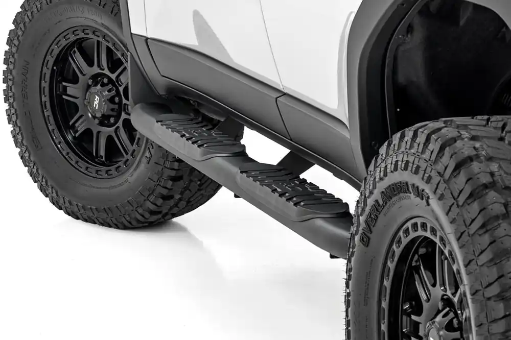 Give your Toyota Land Cruiser a functional upgrade with Rough Country’s Oval Nerf Step Bars. Built for strength and style, these heavy-duty steel side steps provide a rugged yet refined look that complements your Land Cruiser’s factory design.Durable Steel Construction: Engineered with tough, corrosion-resistant steel and a premium black powder coat finish, these steps support up to 500 lbs per side while standing up to harsh conditions.Wide 4.5-Inch Stepping Area: The generous step surface features an integrated non-slip pad, giving you a stable, secure footing for easy entry and exit – even in wet or muddy conditions.Sleek, OEM-Inspired Styling: The classic oval shape and smooth 30-degree angled ends deliver a clean, contoured look that pairs perfectly with the Land Cruiser’s lines, especially on lifted models.Easy, No-Drill Installation: Designed for a precise fit, these steps bolt directly to factory mounting points – no cutting, drilling, or special tools required.Peace of Mind Guarantee: Backed by Rough Country’s 5-Year Limited Warranty, these nerf steps are a dependable, long-term upgrade for your Land Cruiser.