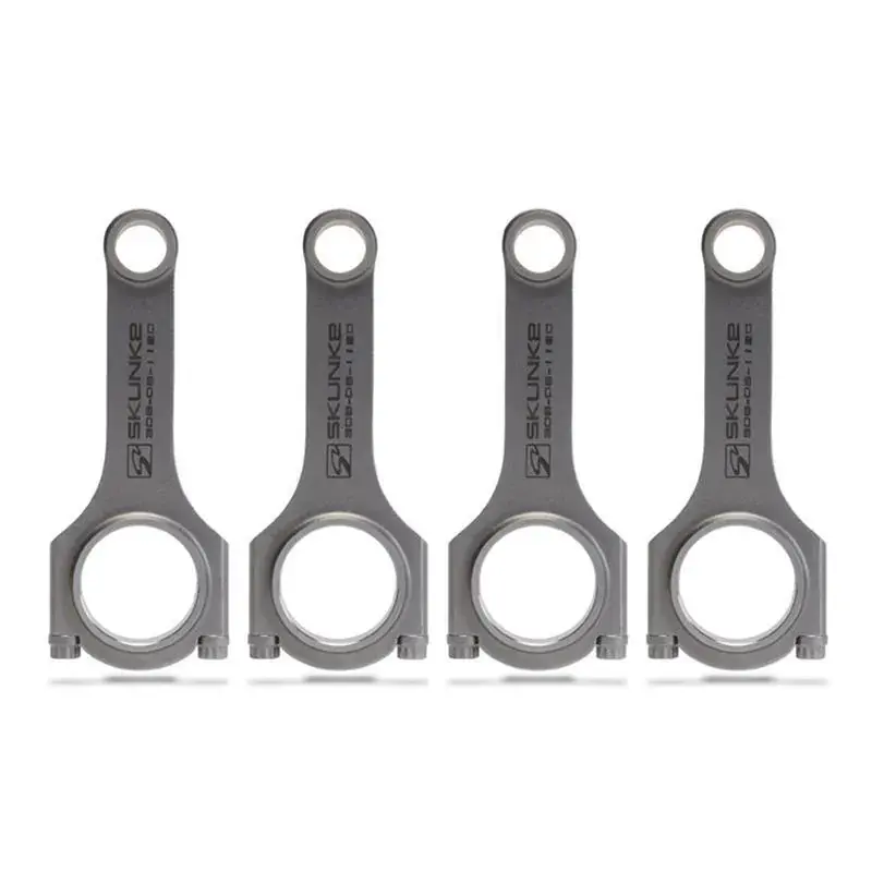 Skunk2 is proud to introduce its all-new Alpha Series Connecting Rods, available for most popular Honda and Acura applications.Alpha Series Rods are forged from select 4340 chromoly steel and feature a straight H-beam design, resulting in the ultimate strength-to-weight ratio. 4340 chromoly is one of the strongest materials available, however, not all 4340 chromoly is the same. As such, Skunk2 relies on extensive material testing and works closely with its foundry to produce high-quality rods at an affordable price. Comprehensive heat-treating, tempering, and shot-peening processes together ensure that each Alpha Series Rod remains consistent and strong. Finally, each rod is magna-fluxed to ensure integrity and that each process has been completed thoroughly and according to Skunk2s rigid specifications.Skunk2s engineers spent nearly three years developing and testing its straight H-beam rod design. The results are one of the strongest beam configurations available, capable of handling more than 900 hp. Engineers made use of FEA (Finite Element Analysis) to determine high-stress points and implemented features to reduce wear and increase strength. Skunk2s straight design distributes stress across a larger area when compared to tapered rods, providing additional support where necessary.Alpha Series Rods are manufactured from two-piece forgings, resulting in optimal grain orientation along the rod cap for increased strength. By orienting the metals grain in the direction of stress along the rod cap, perpendicular to the stress exerted along the beam, strength is significantly increased. Skunk2s two-piece forgings provide a precision-tight fit between the rods cap and its beam without resorting to the brittle materials required by other processes.Alpha Series Rods also feature dual oil passages at their pin ends, providing additional lubrication and cooling, which leads to an even stronger, more durable rod. Unlike other designs, Skunk2s carefully positioned, offset oil passages help deliver lubrication around the entire wrist pin, during each phase of the engine cycle.Connecting rod bolts endure more stress than any other engine fastener. Each Alpha Series Rod features high-quality, Skunk2-branded, 3/8-inch ARP2000 bolts. ARP2000 rod bolts are forged, heat-treated, precision-machined, and capable of clamping loads as high as 220,000 psi. Precision-machined, bronze wrist pin bushings are also fitted to each Alpha Series Rod for increased wear resistance, and are compatible with most aftermarket pistons without additional machining.Not all forged H-beam rods are the same. Only Skunk2s Alpha Series Rods feature our unique design, precision machining, and are capable of handling more than 900 hp, all at an economical price.*FEATURES:** Precision Machined* 3/8-Inch ARP2000/Skunk2 Bolts* Shot-Peened For Reduced Fatigue* Bronze Wrist Pin Bushings* Laser-Etched Skunk2 Logo For Authenticity* Fatter, H-Beam Design Without Drastic Weight Increase* Pin End Compatible With Most Pistons Without Machining* Dual-Pin Oil Passages For Increased Lubrication And Strength* 900+ HP Capable* Balanced +/- 1 Gram* Magna-flux Inspected* Heat-Treated* FEA Analyzed