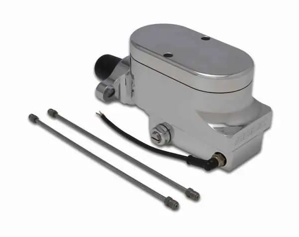 Combo billet aluminum dual bowl master cylinder with 1-1/8″ bore, GM mount, built-in adjustable proportioning valve, distribution block, wiring pigtail for rear brake light switch, and plain cap. For vehicles with O.E. power disc brakes.