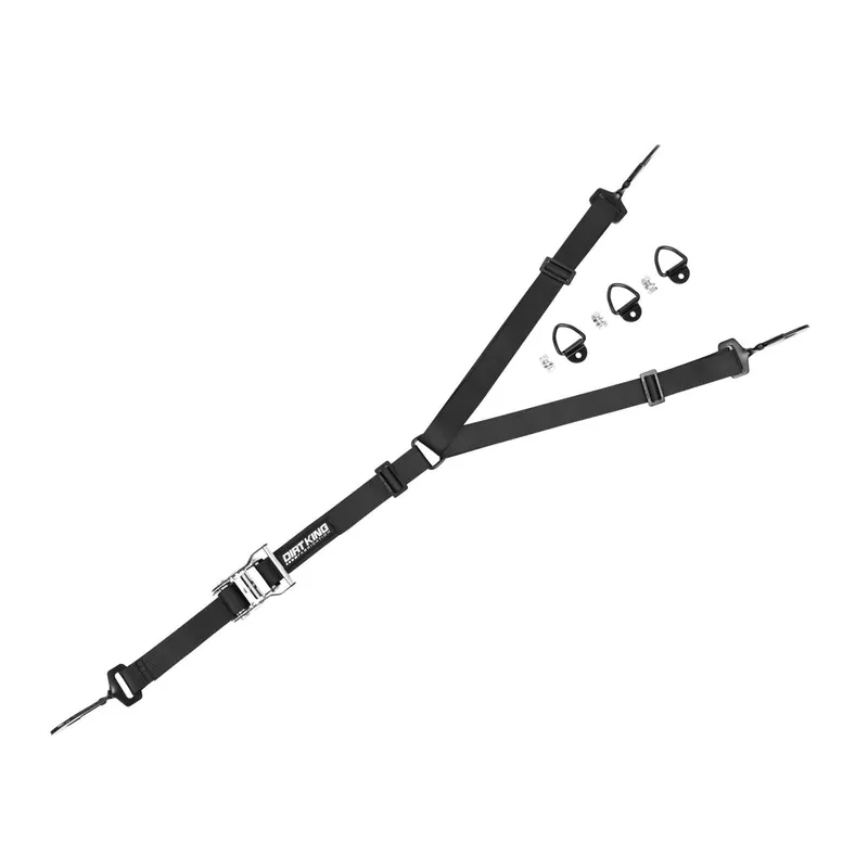 The Dirt King 3 way spare tire strap is simple and effective way to secure your spare wheel. It has a compact handle and holds up great outdoors. D-rings and mounting hardware are included. Works with one spare tire or a pair of stacked tires.