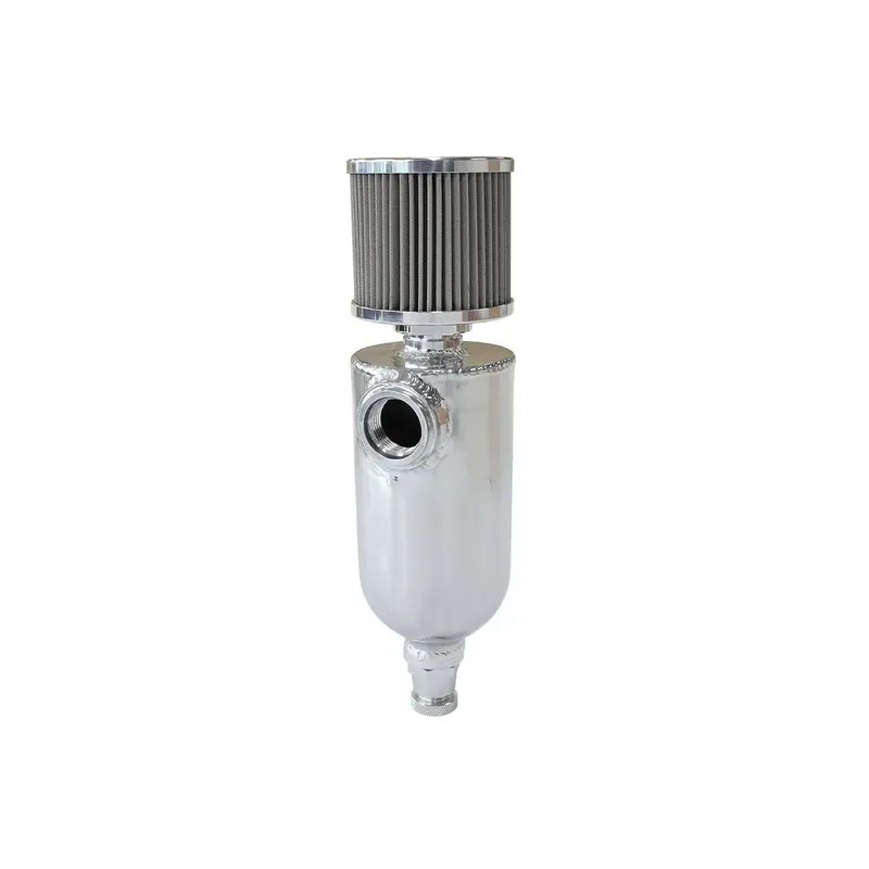 This Aeroflow Performance universal breather tank is an essential step in removing PCV oil before it enters the combustion chamber. This is used on the fresh air side of an engine breather system and is open to the atmosphere or plumbed back into the system after the MAF sensor on EFI equipped engines.