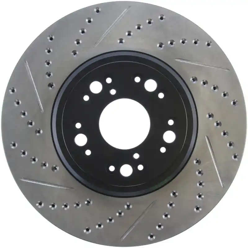 StopTech Drilled and Slotted Sport Rotors are 1-piece direct replacement brake discs for factory brake systems and stock calipers that look great behind your wheels – and offer significantly improved braking performance. The unique cross-drilling and slotting aids with heat and brake dust dispersal; prevents glazing of the pads; adds bite and improves wet and dry braking performance. Built to last; the black e-coating provides protection from corrosion and the high carbon metallurgy (in most applications) offers quieter operation; better crack resistance and increased performance.